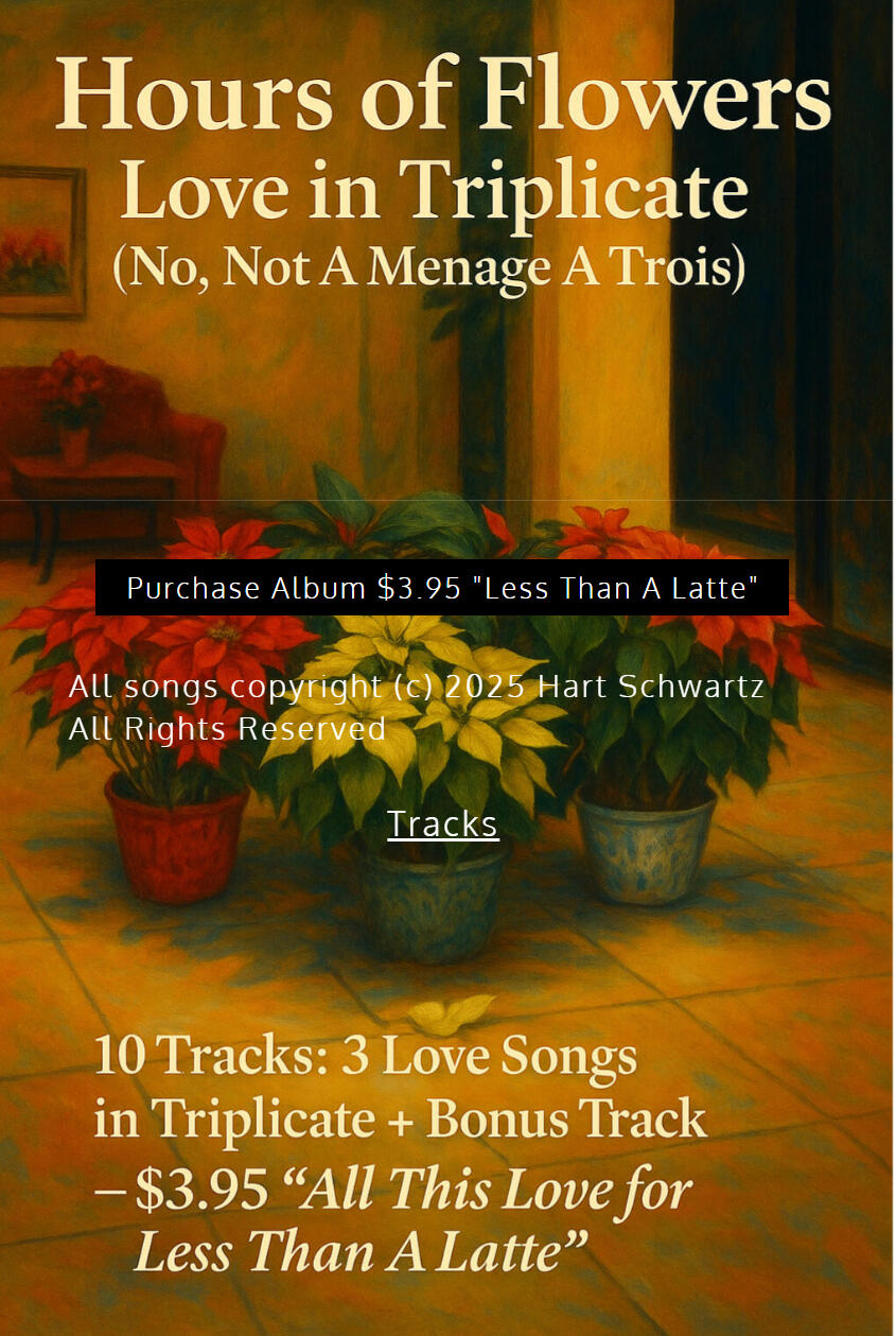 Experimenting with new art form by releasing album where three original love songs are each presented in three different musical arrangements. AI music generator was used as a tool for learning how the lyrics would sound, “side by side,” in distinctively different styles, showcasing the flexibility and subtlety of the same lyrics when set to different music.Copyright © 2026 Hart Schwartz All Rights Reserved
